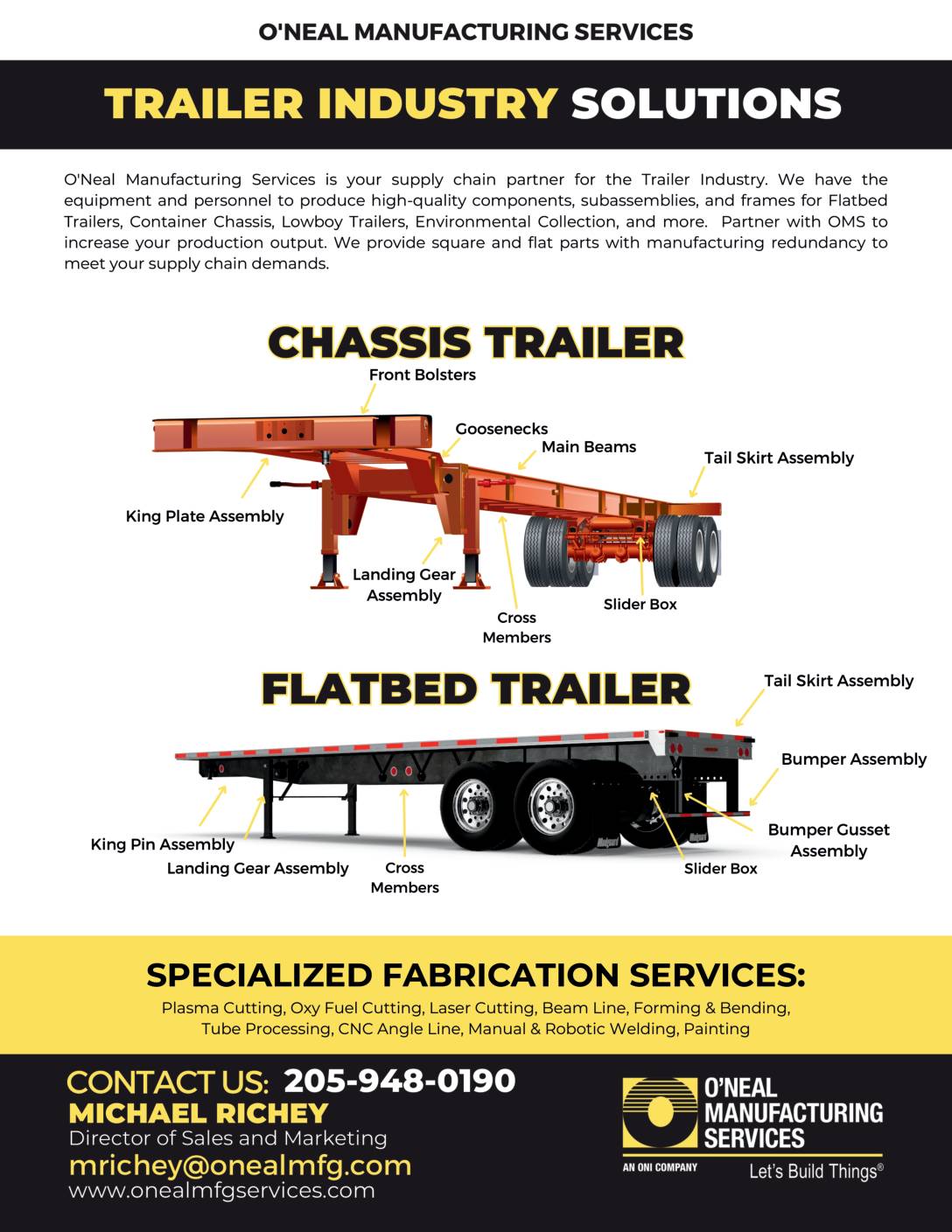 O’Neal Manufacturing Services (OMS) has the equipment and the capabilities to manage the production of subassemblies and frames – whether riveted, fastened, or welded. Sourcing components and subassemblies for semi-truck and trailer production lines is a cost-effective procurement strategy for these manufacturers. OMS can help solve typical sourcing challenges with direct, daily delivery to production lines across the country.
