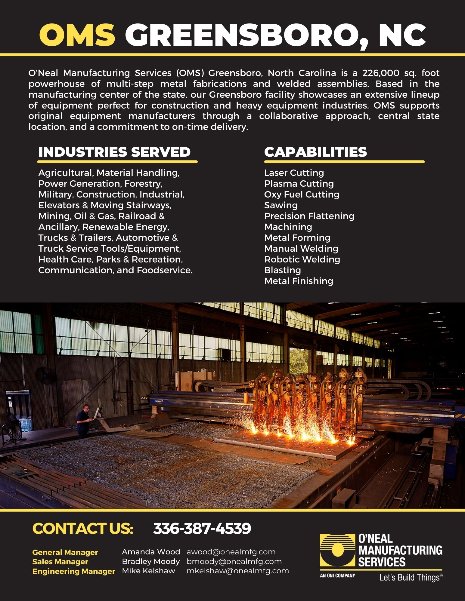 O’Neal Manufacturing Services (OMS)-Greensboro, North Carolina is a 226,000 sq. ft. powerhouse for multi-step metal fabrications and welded assemblies. Based in the manufacturing center of the state, our Greensboro facility showcases an extensive lineup of equipment with experienced personnel to support your supply chain. OMS supports original equipment manufacturers in the construction and heavy equipment industry through a collaborative approach, central state location, and a commitment to on-time delivery.