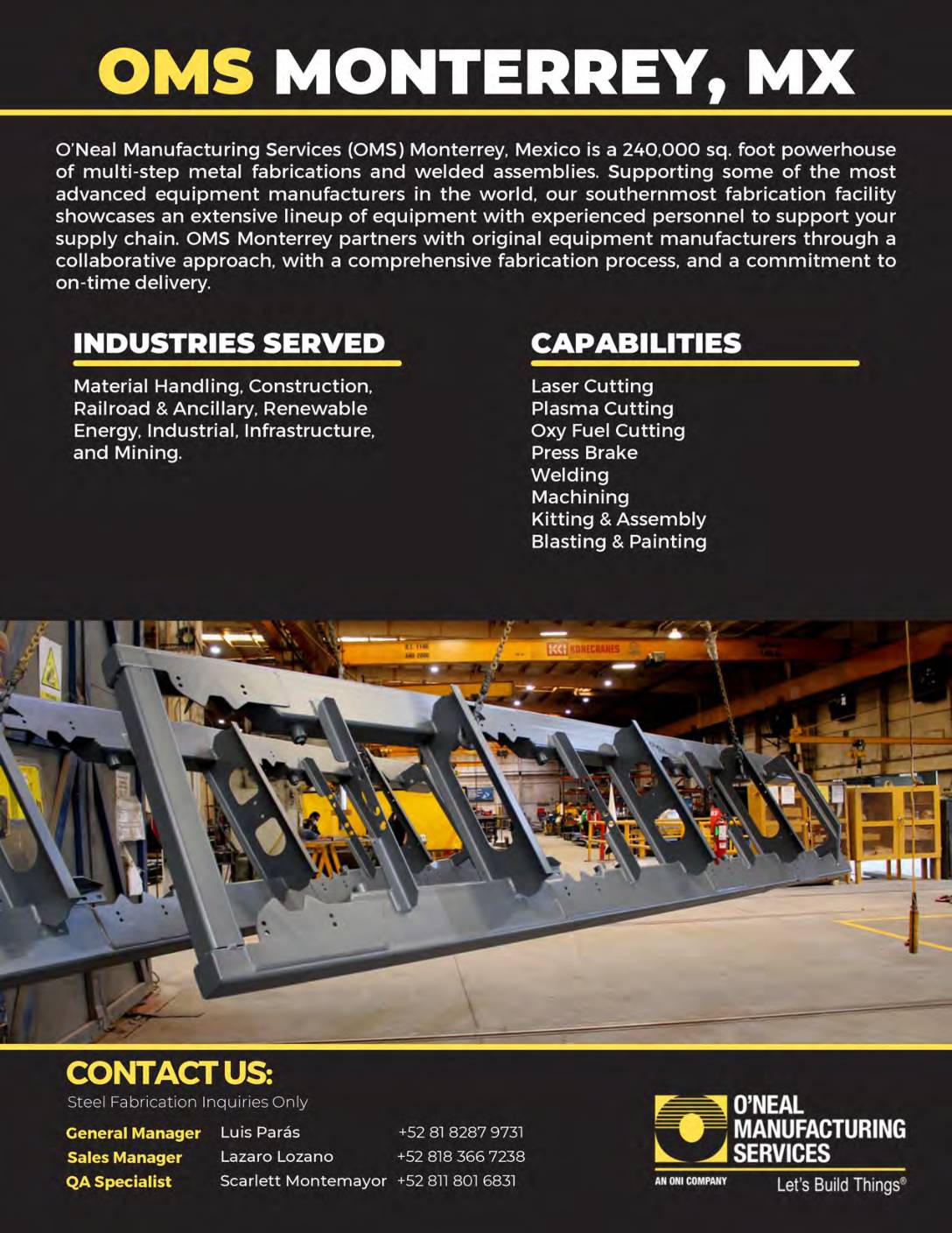 Located at the industrial center of Mexico, O’Neal Manufacturing Services (OMS)-Monterrey is a powerhouse in multi-step processing and machined assemblies. At 240,000 square feet, our production facility boasts a wide range of capabilities including precision welding, metal forming, laser cutting, plasma cutting, oxy fuel cutting, machining, blasting, painting, kitting, and assembly. With more than 25 years of operational excellence in Monterrey, Mexico, our dedicated team has been at the forefront of innovation, commitment, and quality fabrication.