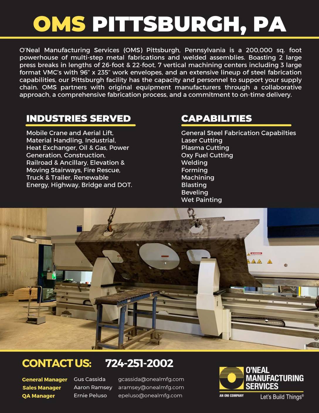 O’Neal Manufacturing Services (OMS)-Pittsburgh is a 200,000 sq. ft. powerhouse of multi-step metal fabrications and welded assemblies. Boasting 3 large press breaks in lengths of 26′, 23″ and 14′, 7 vertical machining centers including 3 large format VMCs with 96″ x 235″ work envelopes, and an extensive lineup of steel fabrication capabilities including wet painting, CNC controlled beam line, and manual and robotic welding, our Ambridge, Pennsylvania facility has the capacity and personnel to support your supply chain. OMS partners with original equipment manufacturers through a collaborative approach, a comprehensive fabrication process, and a commitment to on-time delivery.